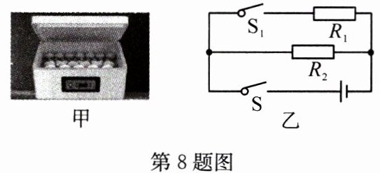 8. (2024·广东深圳)图甲是某款鸡蛋孵化器,底部装有加热器。通电后,加热器对水加热,水向上方鸡蛋传递热量,提供孵化所需能量。孵化器简化电路如图乙所示$,R_1、$$R_2$都是发热电阻,孵化器相关参数如下表所示。
