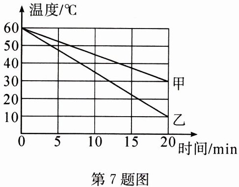 7. 小明在探究“物质的放热能力与哪些因素有关”时,分别用质量均$0.5$kg的水和另一种液体进行对比实验,并用图像对实验数据进行了处理,如图所示。实验过程中,水和另一种液体在相同时间内放出的热量相等,分析图像可以得出: