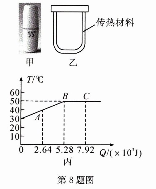 8. (2023·潍坊)图甲所示为一款新型水杯,将沸水倒入杯中,轻摇几下后,水温便可降至$55^{\circ}C$左右,并能保温3小时。图乙为其内部结构图,杯壁的不锈钢夹层中有晶体传热材料,其在常温下是固态,会随着温度的变化发生可逆的固液转换。取$0.3$kg该晶体材料进行加热,其温度与吸收的热量关系如图丙所示。下列分析正确的是(