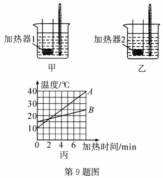 9. 如图所示,甲、乙两相同容器中分别装了质量相等的$A$、$B$两种液体,用相同的电加热器加热,忽略散热损失,得到如图丙所示的液体温度与加热时间的图像。下列说法正确的是(