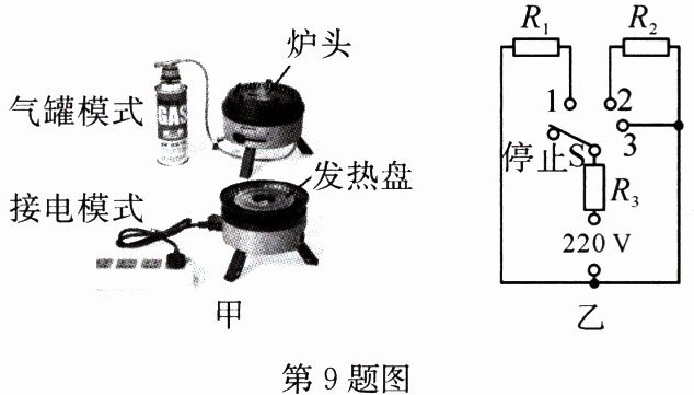 9. 如图甲是一种便携式电气两用分体炉,可接气罐或电源使用,搭配1.8L煮锅、1.3L炒锅、1L煎锅三种不同锅型,可满足不同烹饪需求。气罐模式下,燃料在炉头处燃烧,给锅体加热,可通过阀门调节火力大小。接电模式下,电热丝在发热盘内发热,给锅体加热,其工作电路如图乙所示$,R_1、$$R_2、$$R_3$均为电热丝,调节开关S的位置可以实现多挡位工作的要求。
