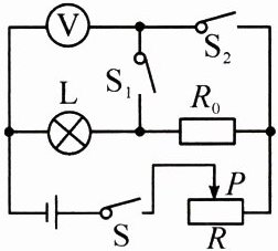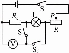 ① 电路如图所示。闭合 $ S $、$ S_1 $,断开 $ S_2 $,调节滑动变阻器 $ R $,使得电压表示数为 $ I_{额}R_0 $,此时小灯泡正常发光;