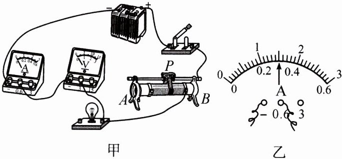 (2) 某次实验过程中电压表示数为 $ 2 \, V $,为测定小灯泡的额定功率,小红应将变阻器滑片向____(选填“$ A $”或“$ B $”)端移动,同时注意观察电压表的示数变化,直到小灯泡正常发光,此时电流表示数如图乙所示,则小灯泡的额定功率为____ $ W $。