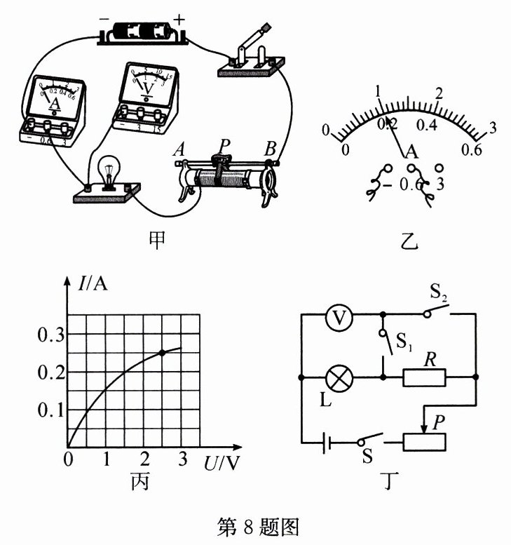 (选填“$ A $”或“$ B $”)端移动,使小灯泡逐渐变亮。(3) 某次实验时,电流表的示数如图乙所示,则通过小灯泡的电流为