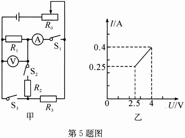5. (2023·德州)如图甲所示,电源电压$U$保持不变,当只闭合开关$S_{1}$,滑动变阻器的滑片从最右端滑向中点过程中得到电压表与电流表示数的变化图像如图乙所示。闭合开关$S_{1}$、$S_{3}$,断开$S_{2}$,滑动变阻器的滑片在最左端时,电路的总功率为$15W$。已知$R_{2}= 2R_{1}$,求: