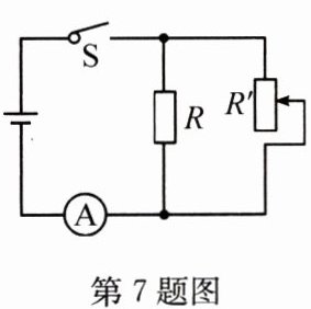 7. 如图所示, 电源电压为 6 V 且保持不变, 电阻 R 的阻值为 30 Ω, 滑动变阻器 R' 的阻值变化范围为 0 ~ 24 Ω。电流表的量程为 0 ~ 0.6 A。当开关 S 闭合后, 滑动变阻器接人电路的阻值最小为