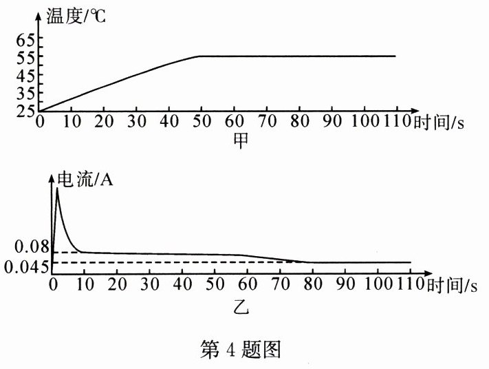 4. (2023·广东广州)把一个某种类型的电阻 R 接在电压恒为 12 V 的电源两端,通电后,同时记录 R 的温度—时间图线、流过 R 的电流—时间图线如图甲、乙所示: