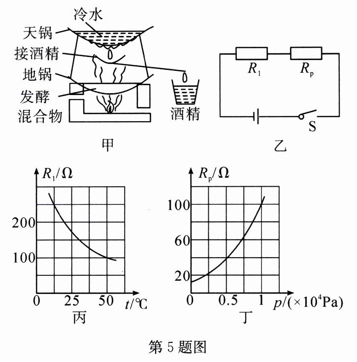 5. (2024·内蒙古包头)图甲为低温液化制酒示意图,天锅内装有 1 m 高的冷水,底部连有控制排水与注水的装置,该装置内部简化电路如图乙所示。电源电压恒为$ 12 V,R_1$为热敏电阻,其阻值随天锅中水温变化关系如图丙所示,当水温达到 50℃时,排水口打开将水全部排出;Rₚ为压敏电阻,其阻值随水对锅底的压强变化关系如图丁所示。当水压为 0 时,注水口打开,排水口关闭,将冷水注入天锅,注水高度达到 1 m 时注水口关闭。(ρ水$ = 1.0×10^3 kg/m^3,g $取 10 N/kg,不考虑水的蒸发)求:
