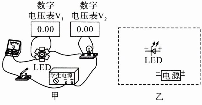 7. 小明探究小灯泡、LED 两端的电压随电流变化的情况,连接了如图甲所示的实物电路,其中电源可以提供不同的电压。