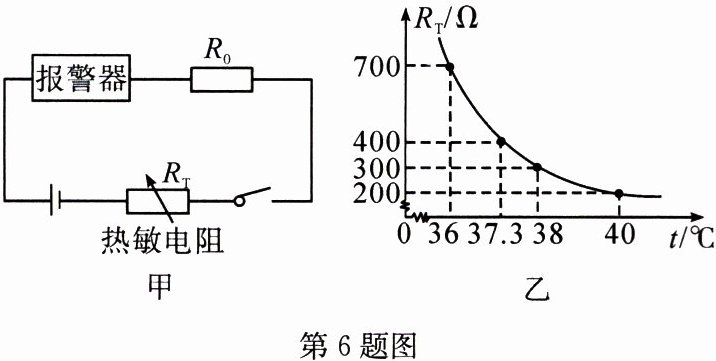6. 小明设计了如图甲所示的模拟智能测温报警电路,电源电压恒为 12 V,通过报警器(电阻不计)的电流超过 10 mA 时就会报警,热敏电阻 R_T 的阻值随温度 t 的变化关系如图乙所示。要求:当所测温度达到或超过 37.3℃时,系统报警。