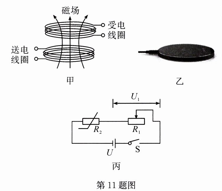 (4)如图丙为充电器过热保护的模拟控制电路。电源电压为图乙充电器的输入电压$,R_1 $是滑动变阻器$,R_2 $是热敏电阻,其阻值随温度升高而减小。当$ R_1 $两端电压$ U_1 ≥ 4 V $时,控制电路将切断充电电路,实现对充电器的保护。控制电路恰好切断充电电路时$,R_2 $的电功率为 2 W,此时$ R_1 $接入电路的阻值为多少?若要适当提高预设温度,应如何调节滑动变阻器$ R_1?$