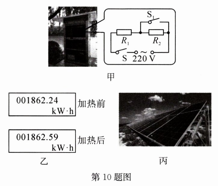 (3)为节能减排,相关部门计划在该公园安装如图丙所示的太阳能电池为饮水机供电。已知晴天$ 1 m^2 $太阳能电池一天能发电 0.4 kW·h,要求所有太阳能电池晴天一天的发电量能供饮水机使用 3 天。饮水机每天正常工作加热时间计为 3 h,保温时间计为 8 h,求至少要安装多大面积的太阳能电池。