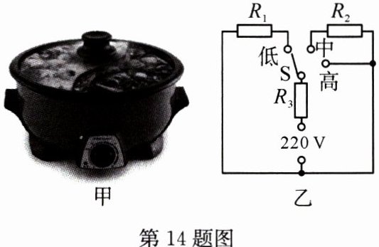 14. (2024·黑龙江龙东)一款小型电火锅如图甲所示,通过挡位开关实现高、中、低三挡控温功能;图乙是它的简化电路图$,R_1、$$R_2、$$R_3$均为加热电阻(阻值保持不变)。已知$R_1$的阻值为176Ω,电火锅的部分参数如下表所示。
