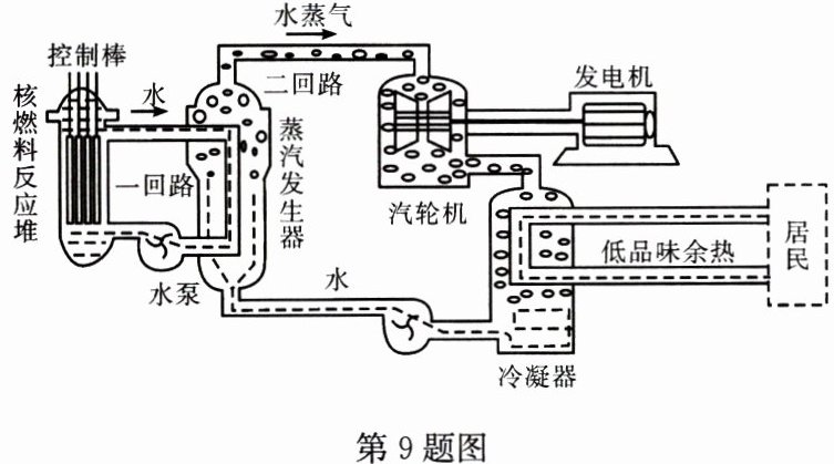 9. (2024·江苏无锡)某核电厂在利用核能发电的同时给居民供暖。其工作流程如图所示,核燃料反应堆内有低浓度的铀235,发生核反应后产生大量的热。一回路和二回路是两个互不相通的水循环回路,一回路的水流过核燃料反应堆的堆芯,带走核反应堆产生的热量,在蒸汽发生器中将热量传递给二回路的水,然后流回堆芯;二回路的水在蒸汽发生器中受热,产生大量高温水蒸气,水蒸气做功推动汽轮机发电,做功后的水蒸气冷凝后返回蒸汽发生器。核能供暖是将发电之后的低品位余热取出来通过管道送给居民。单个机组,如果仅供电,每秒提供的电能为$1.25×10^9 J;$若在供电的同时进行供热,每秒提供的电能为$1.21×10^9 J、$热量为$2×10^8 J,$对单个机组核燃料反应堆产生的能量使用效率提高了3.2%。(标准煤的热值取$3.0×10^7 J/kg)$