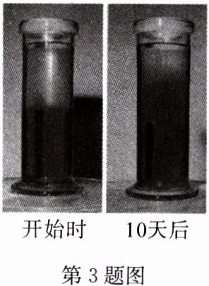 3. 如图所示,在量筒中装一半清水,再将硫酸铜溶液注入水的下方,观察到蓝色的硫酸铜溶液与无色的清水之间有明显的界面;静置10天后,界面逐渐模糊不清了。这种现象主要表明(