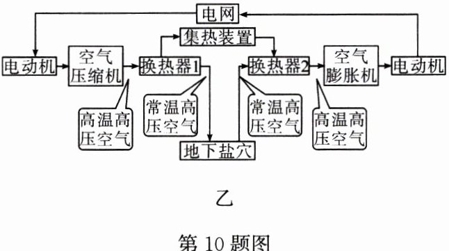 该项目工作原理如图乙所示,用电低谷时段,将电网多余的电能通过空气压缩机把空气压缩到地下盐穴中(地下盐层中的洞穴);用电高峰时段,将储存在盐穴中的高压空气释放,驱动空气膨胀机转动,连接发电机发电。