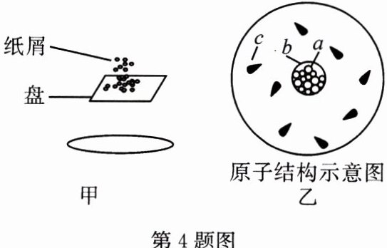 4. 图甲中纸屑间受电荷相互作用而排斥,并受到盘的排斥力,从盘面飞起散开,图乙为原子结构示意图。下列说法正确的是(