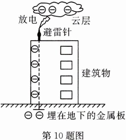 10. (2024·广东广州) 如图,带负电的云层靠近建筑物上的避雷针时,向避雷针剧烈放电形成雷电。下列说法正确的是(