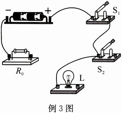 例3 (2023·陕西)小明设计了一款道路井盖移动报警电路。该电路由电源、警示灯L、保护电阻$ R_0 $、开关$ S_1 和 S_2 $组成。闭合开关$ S_1 $,当井盖未被移动时,相当于开关$ S_2 $闭合,警示灯L不亮;当井盖被移动时,相当于开关$ S_2 $断开,警示灯L发光提醒路人。请根据以上要求,将图中的电路补充完整。