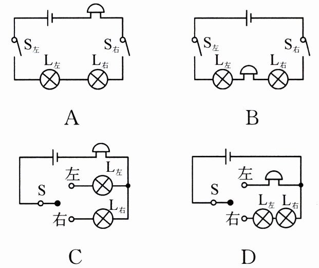 8. 某汽车上装有转向灯和蜂鸣器,开关拨至“左”,左转向灯亮、蜂鸣器响;开关拨至“右”,右转向灯亮、蜂鸣器响,左、右转向灯不能同时亮,则下列电路图设计合理的是(