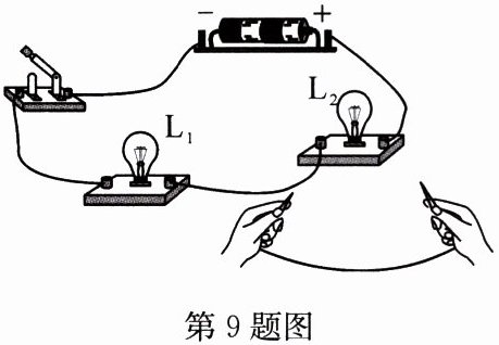9. 如图是小勇连接的实验电路,他检查导线连接无误后,闭合开关,发现灯泡$L_1、$$L_2$均不发光,于是他用一根导线来排查故障。当导线连接到$L_1$两端时$L_1$不发光、$L_2$发光,连接到$L_2$两端时两灯都不发光,由此判断电路的故障是(
