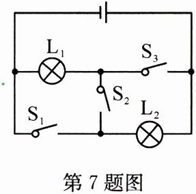 D.闭合开关$S_1、$$S_3,$两个灯泡并联