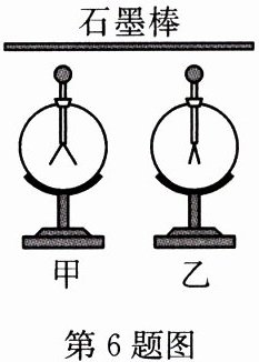 6. (2024·四川广元)如图,在干燥环境中,取两个相同且不带电的验电器甲和乙,用毛皮摩擦过的橡胶棒接触甲的金属球,甲的金属箔片张开;再用石墨棒连接甲、乙验电器的金属球,观察到乙的金属箔片张开。下列对上述实验过程的分析,错误的是(