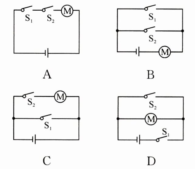 10. (2024·湖南长沙)中国高铁技术世界领先,给人们出行带来极大的便利。乘客进站时,需同时通过身份证验证(相当于闭合$S_1)$和人脸识别(相当于闭合$S_2),$方可开启闸机M。下列电路设计符合要求的是(