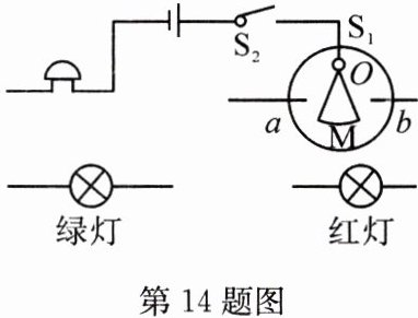 14. 小明根据“地动仪”原理,利用所学的电学知识,设计了一款“电子地动仪”,其中$S_1$为重力开关,M可绕O点自由转动。当闭合开关$S_2$时,“地动仪”水平时,M在a、b中间。当“地动仪”向左倾斜时,绿灯亮、电铃响;当“地动仪”向右倾斜时,红灯亮、电铃响。请完成电路的连接。