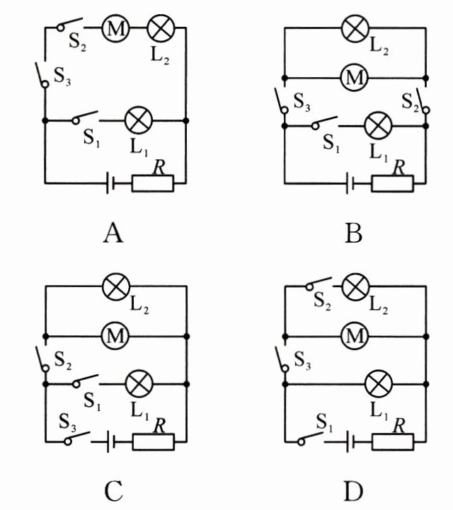 12. (2024·山东潍坊)共享电动单车极大地方便了人们的出行。使用电动单车前先摇晃车把检查电量,此时开关$S_1$闭合,只有电量指示灯$L_1$亮起;确认电量充足后扫码开锁,此时开关$S_2$闭合,日间行车灯$L_2$亮起,电动机M启动,且日间行车灯$L_2$损坏时电动机M仍可正常工作;电动单车在规定区域内,开关$S_3$始终处于闭合状态,如果驶离规定区域,开关$S_3$自动断开,电动机M、行车灯$L_2$均无法工作,指示灯$L_1$可正常工作。下列电路设计符合要求的是(