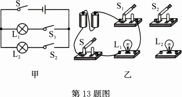 13. 请按照如图甲所示的电路图,连接图乙中的实物元件。
