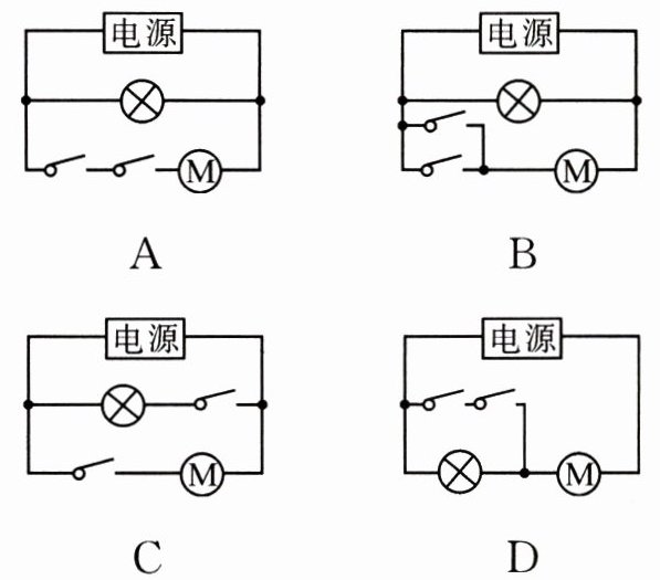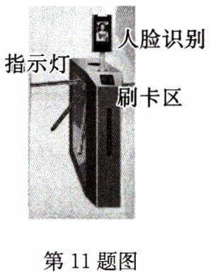 11. (2024·黑龙江鸡西)如图为小区常见的智能门禁系统,住户可以通过刷卡或人脸识别进入小区,当门禁系统接通电源后,指示灯发光。住户刷卡或人脸识别成功时(相当于分别闭合对应的开关),电动机工作,控制门打开。下列关于门禁系统的简化电路设计合理的是(