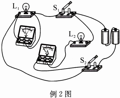 例 2 (2024·四川眉山)如图所示,闭合开关 $ S_1 $、$ S_2 $,小灯泡 $ L_1 $ 和 $ L_2 $ 均正常发光,电流表和电压表均有示数。下列关于电路分析正确的是(