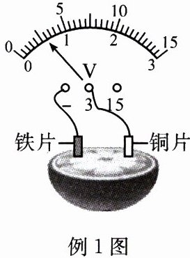 例 1 (2024·江苏淮安)如图所示,取一个橙子,把铜片、铁片插入其中,制成一个水果电池。