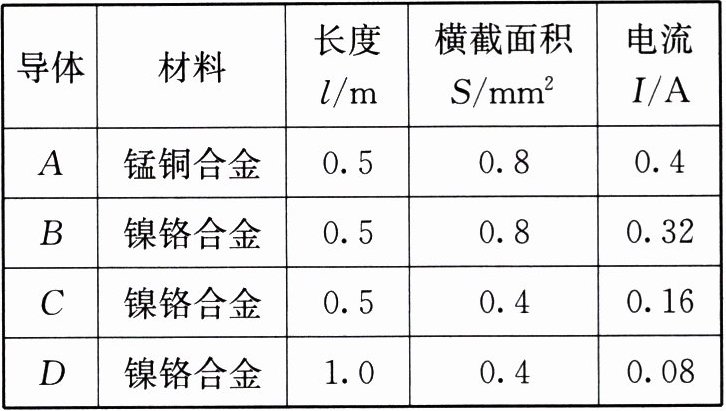 |导体|材料|长度$l/m$|横截面积$S/mm^{2}$|电流$I/A$|