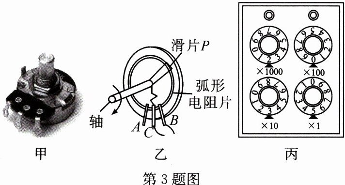 3. 如图甲所示为旋转式变阻器,若图乙中旋转式变阻器的$B$、$C$两接线柱连入电路,则连入电路的弧形电阻片是