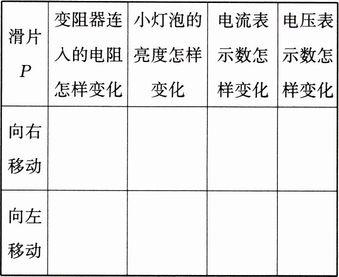 |滑片$P$ | 变阻器连入的电阻怎样变化 | 小灯泡的亮度怎样变化 | 电流表示数怎样变化 | 电压表示数怎样变化 |
