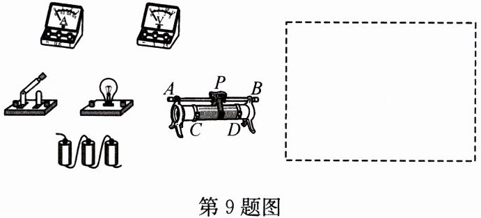 9. 如图给出了几种元件,要求用滑动变阻器控制灯泡中的电流大小,电流表测出总电流的大小,电压表测出灯泡两端的电压。