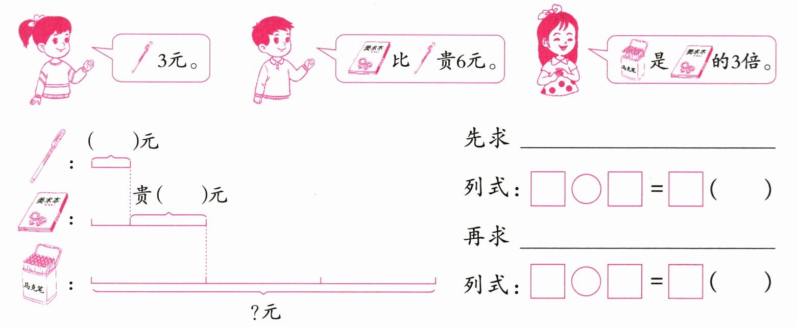 1. 一盒马克笔多少元?(先把线段图补充完整,再解答)
