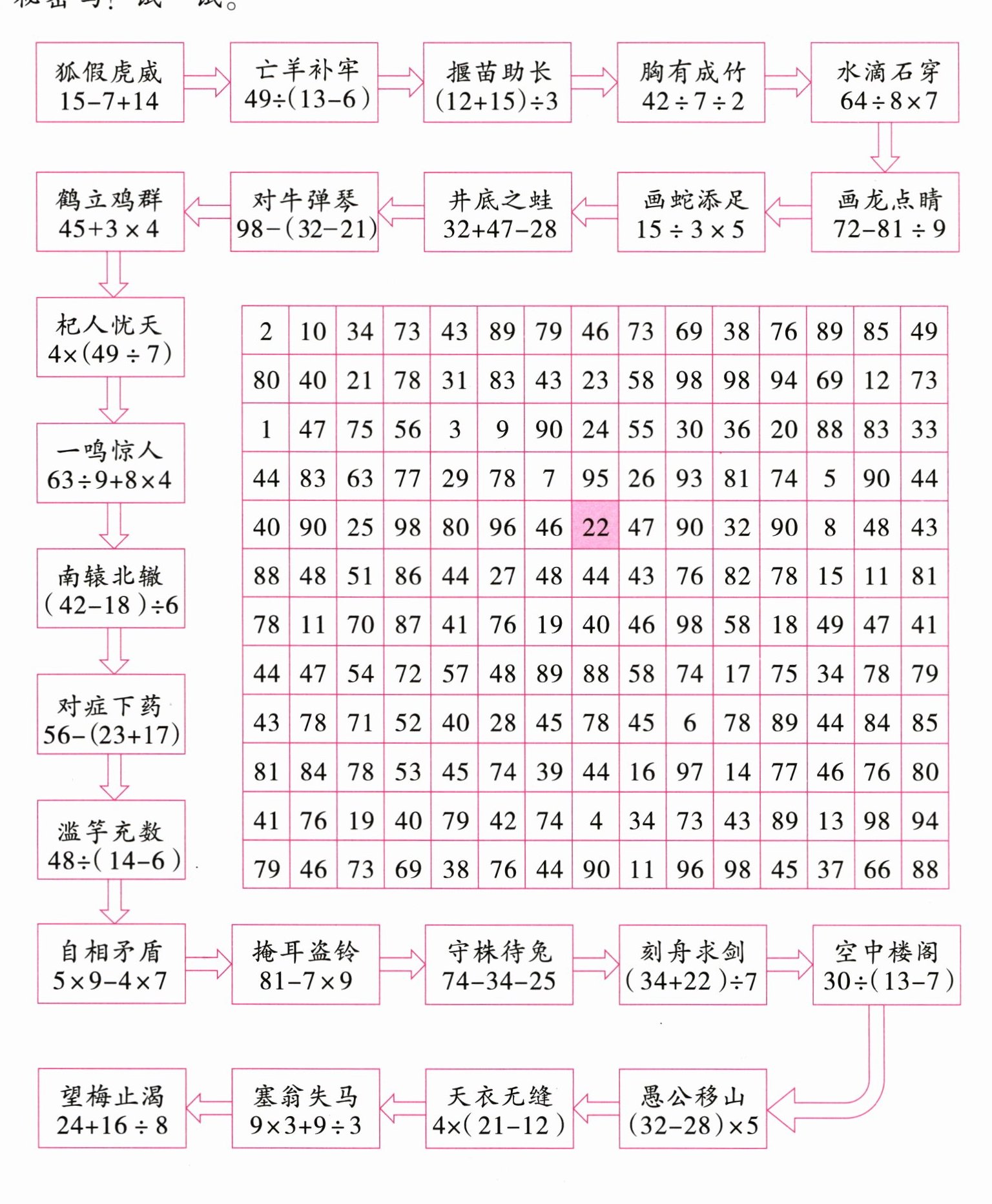 游戏规则:下面的数字表里藏着一个秘密,请你计算出下面成语故事里算式的答案,并在表格中找到正确答案对应的方格,然后涂成红色。你能发现这个秘密吗?试一试。