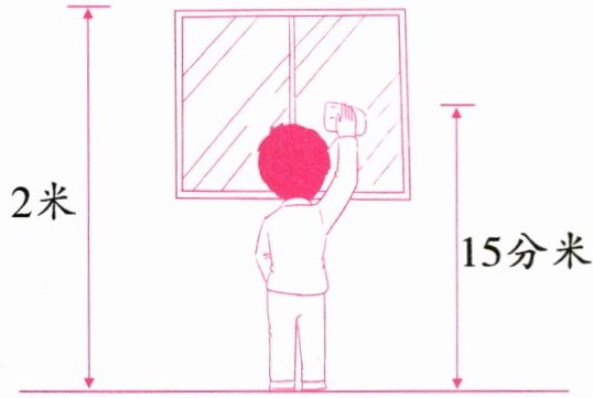 (1)如图,小晋最高可以擦到 15 分米高的地方,如果他使用一个长 30 厘米的擦窗工具,能把玻璃全擦到吗?