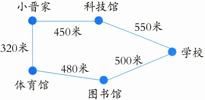 小晋走经过科技馆去学校的这条路最近,是1千米。描图略