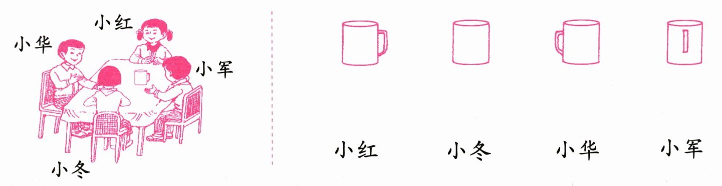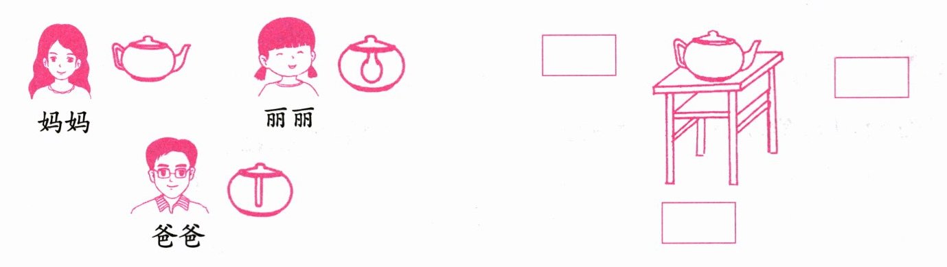 4. 桌上放着一把茶壶,丽丽和她的家人从不同的方向看到了不同的形状。根据他们看到的形状,你能判断出他们的位置吗?填一填。