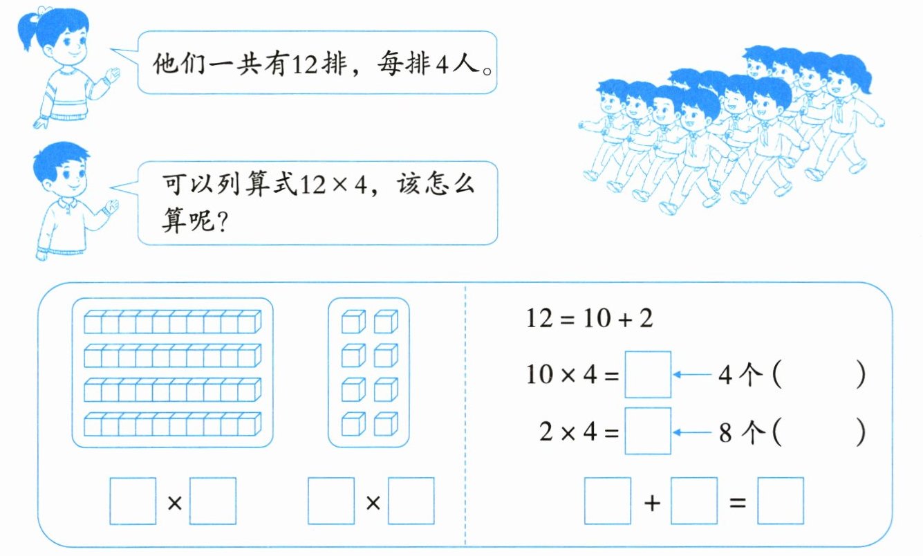 $ \begin{array} { l } { 1 2 = 1 0 + 2 } \\ { 1 0 × 4 = □ \leftarrow 4 \text { 个 ($