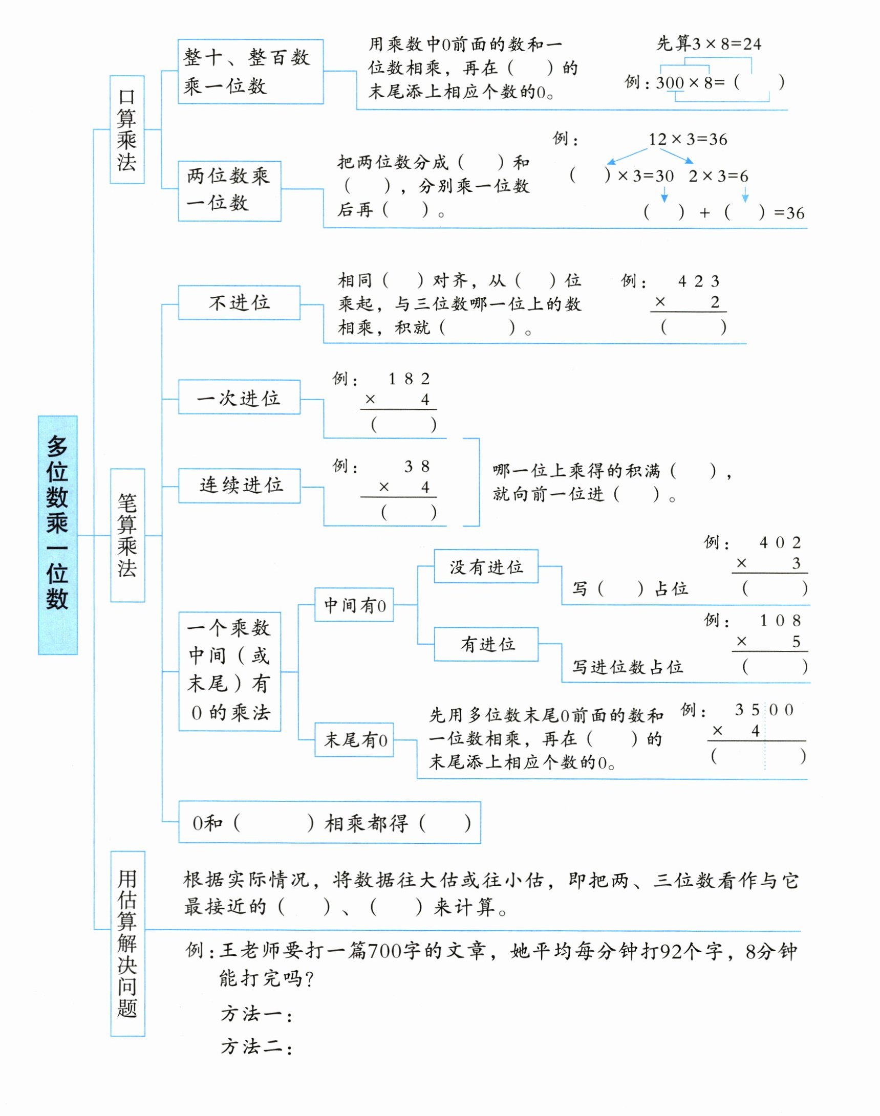 - 整十、整百数乘一位数:用乘数中0前面的数和一位数相乘,再在( )的末尾添上相应个数的0。例:先算$3×8 = 24$,$300×8 = ($$_$)