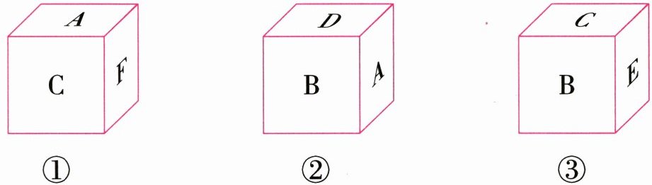 一个正方体的六个面上分别写着 A、B、C、D、E、F 六个字母,从不同的角度观察,各个字母的位置如下图所示。这个正方体相对的两个面上的字母分别是什么?
