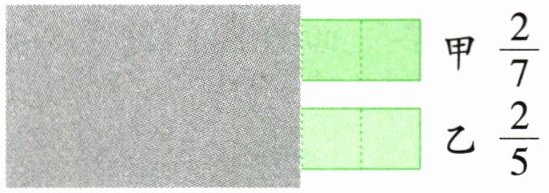 $2. $如图,甲、乙两张纸条被一张纸挡住了一部分,甲纸条露出的部分是全长的$ \frac{2}{7} ,$乙纸条露出的部分是全长的$ \frac{2}{5} 。$甲、乙两张纸条相比,哪张更长$?($