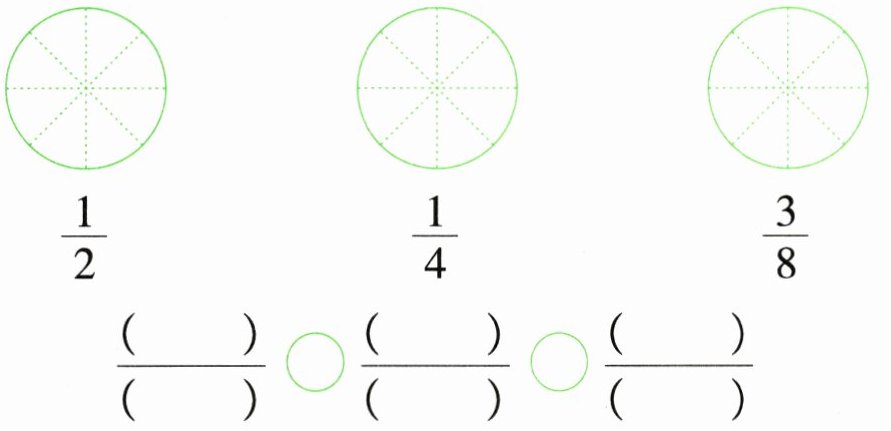 $3. $按要求涂出圆的$ \frac{1}{2} 、$$ \frac{1}{4} 、$$ \frac{3}{8} ,$并比较它们的大小。