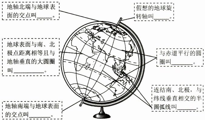 2. 地球仪上的点和线:结合概念,读图填出地球仪上主要的点和线的名称。