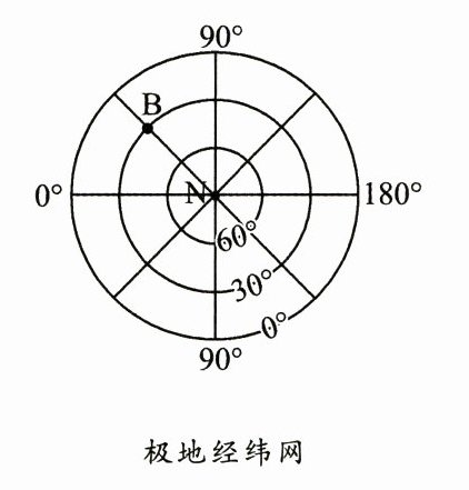判读方法:纬度向北增大为北纬(N),向南增大为南纬(S);经度向东增大为东经(E),向西增大为西经(W)。极地经纬网中,北极上空地球自转呈逆时针,顺自转方向经度增大为东经,减小为西经。